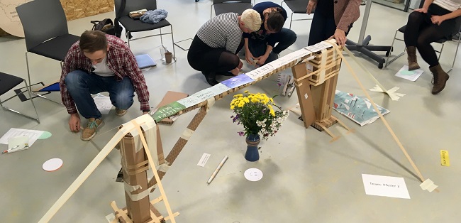 Meine Workshops sind jeweils individuell auf die Herausforderungen des Teams zugeschnitten - mit spielerischen Komponenten. Das können konkrete Team-Building-Workshops sein, in denen das Team die Storming-Phase schneller durchläuft oder aber Workshops in der Norming-Phase, in dem Klarheit über Rollen, Zuständigkeiten und Verantwortungen sowie gemeinsame Regeln erarbeitet werden. Zur Einführung und spielerischen Erprobung neuer Arbeitsweisen eigenen sich Team-Workshops sehr gut (siehe Foto).
